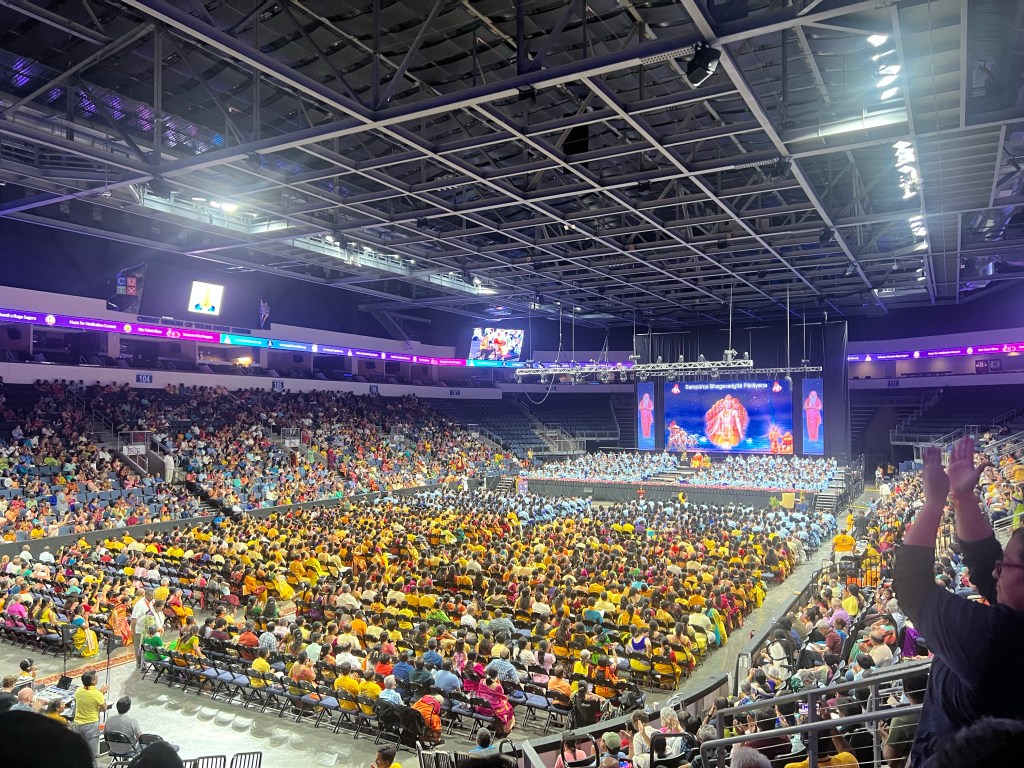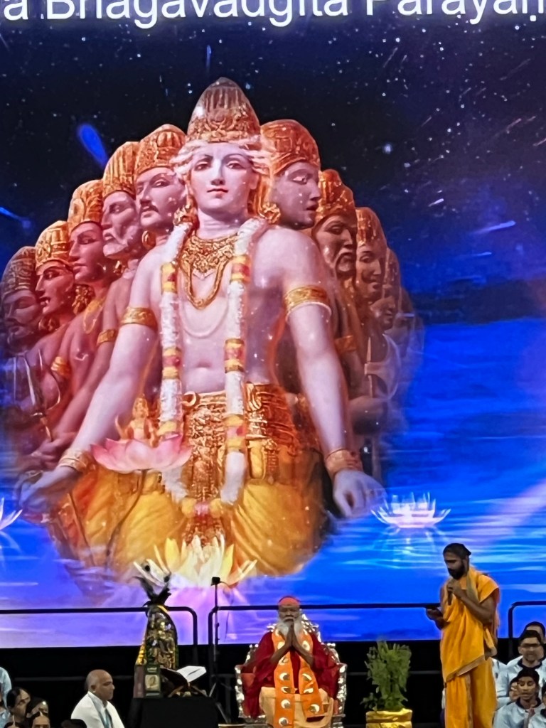 I went to the event thinking I would listen and observe. I came out changed! There were 750 people including children as young as 3 who had memorized the Gita shlokas and chanted them with perfect Sanskrit pronunciation. Many in the ten thousand audience also were well versed and chanted with the trained chanters. I saw my friend on the stage with her group of students who she had diligently trained over the last 10 months. I was so proud of her journey starting from learning the Bhagwad to now teaching it to the next generation of learners.