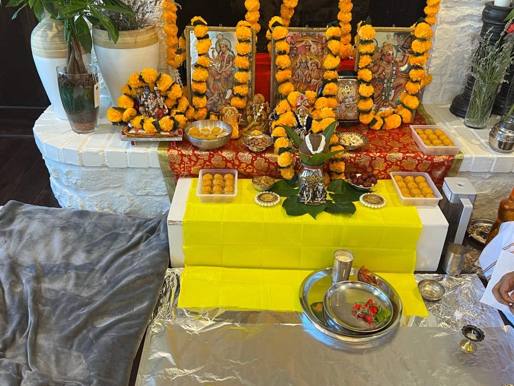 Our day started with our annual Havan. I am a big believer of the Vedic ritual of Havan. At least once a year, we ask our Panditji to perform Havan at our home to purify our home and mind. We also use this opportunity to teach our kids about the significance of fire and other elements in Indian culture. Since my childhood, I have loved the entire process starting with cleaning and setting up the havan area, the chanting of mantras and the smell of havan samagri. Offering a small amount of samagri in the holy fire, every time panditji says “Swaha” is such a spiritual experience. Panditji arrived on time at 10am and by 1pm we had completed the havan after which my kids ate the prasad laddus like grapes. Lunch was traditional North Indian puja food – Puris, kala chana, aaloo tamater, Halwa and Raita – all made without onion and garlic. This is my favorite menu and now my kids too look forward to eating these delicacies whenever I cook them on Hindu festivals.
