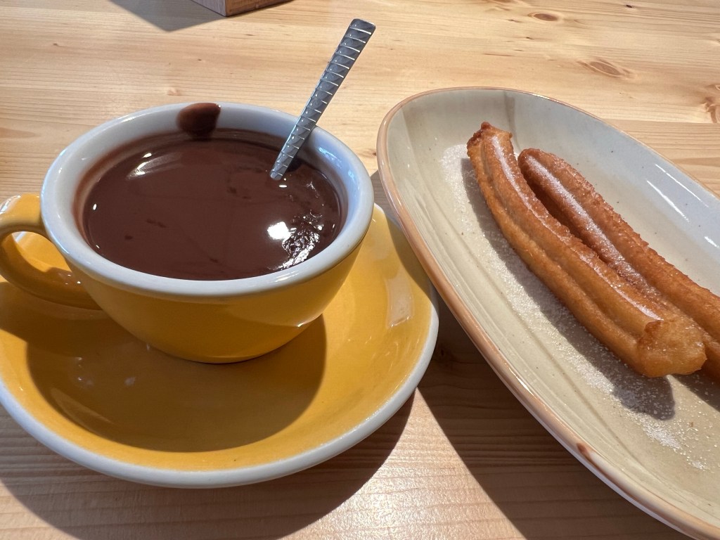 Today was rest day so I kept the walk short. Started at 8 am on a very foggy day and reached my destination by 10.30 only to find out that checkin was at 1 pm. Spent the next few hours checking out the local church, enjoying chocolate and churros, talking to an old friend and finally sitting in the city center park reading my book with 3 old men as company. Lunch was at a super cute garden restaurant with excellent service.